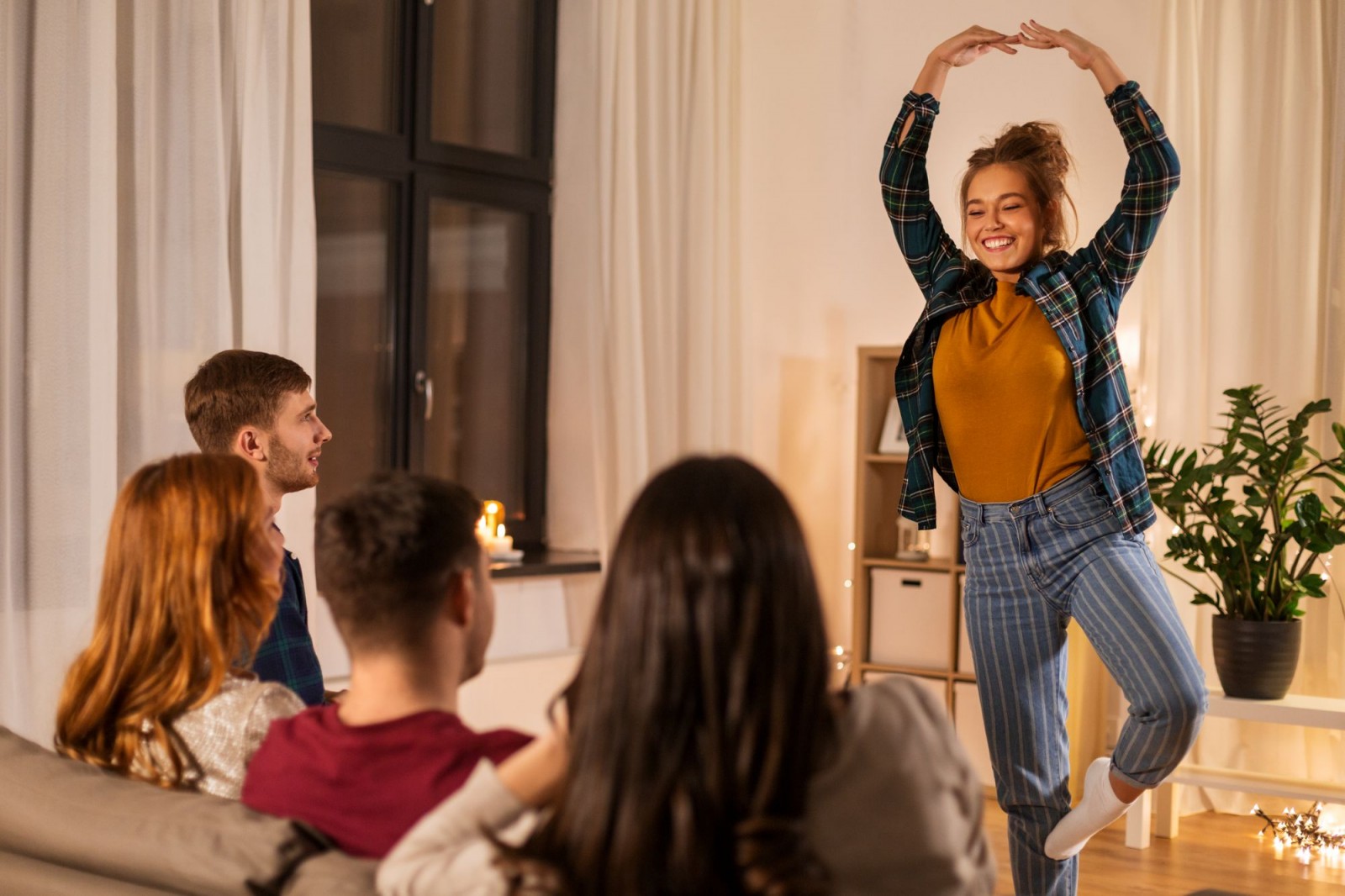 Nếu có không gian rộng, bạn có thể chơi ghế âm nhạc hoặc nhảy rồi đứng hình khi nhạc dừng. Mọi người chỉ cần bật nhạc lên, vừa nhảy vừa di chuyển; đến khi nhạc tắt thì ai không kịp ngồi xuống (với ghế âm nhạc) hoặc đứng yên không kịp (với dance freeze) sẽ bị loại hoặc chịu một hình phạt vui vui.