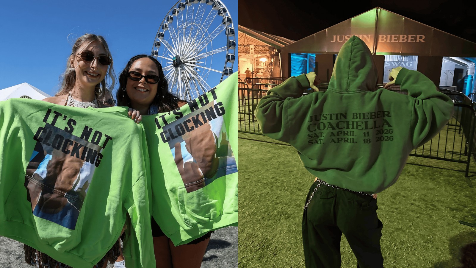 Trong đêm diễn cuối tuần đầu, Bieber xuất hiện với loạt thiết kế chưa phát hành như hoodie fleece xanh “Apple”, áo cổ mở “Smudge” và kính Speed Demon. Anh tiếp tục chiến lược này ở cuối tuần thứ hai với quần denim và phụ kiện của SKYLRK, duy trì công thức quen thuộc: mặc trước để tạo sức hút, rồi mới đưa sản phẩm ra thị trường sau.