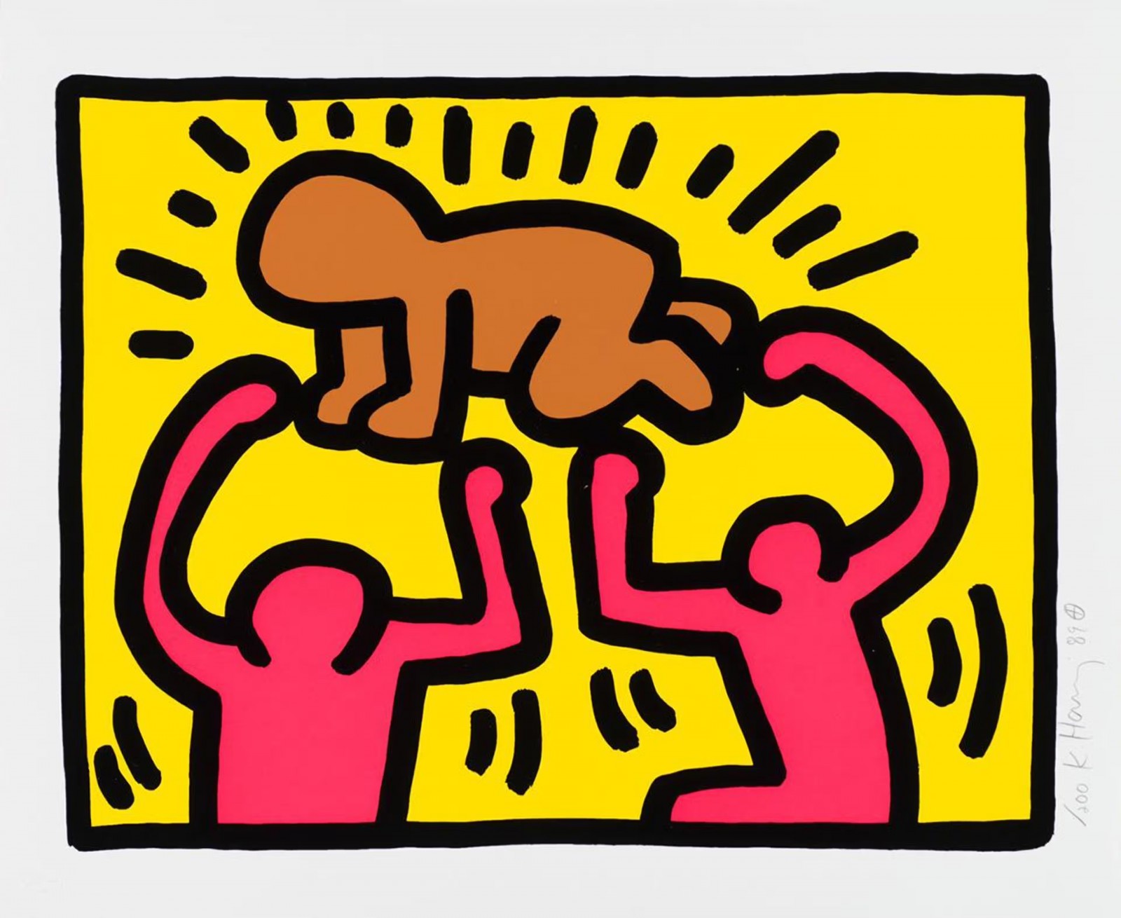 “Radiant Baby” có lẽ là hình ảnh mang tính biểu tượng nhất trong toàn bộ sự nghiệp của Keith Haring. Đó là hình một em bé bò, xung quanh tỏa ra những tia sáng như hào quang.