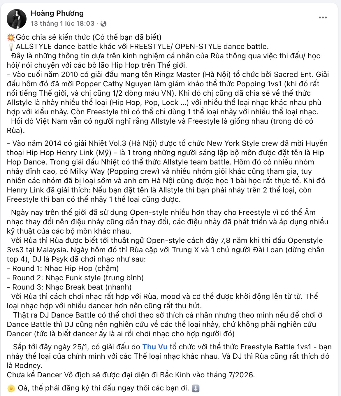 Dưới đây là những chia sẻ từ Rùa - một dancer kỳ cựu trong cộng đồng Hip Hop Việt Nam. Những chia sẻ này được cô đúc kết từ quá trình thi đấu, học hỏi và trò chuyện cùng các bậc tiền bối Hip Hop trên thế giới.