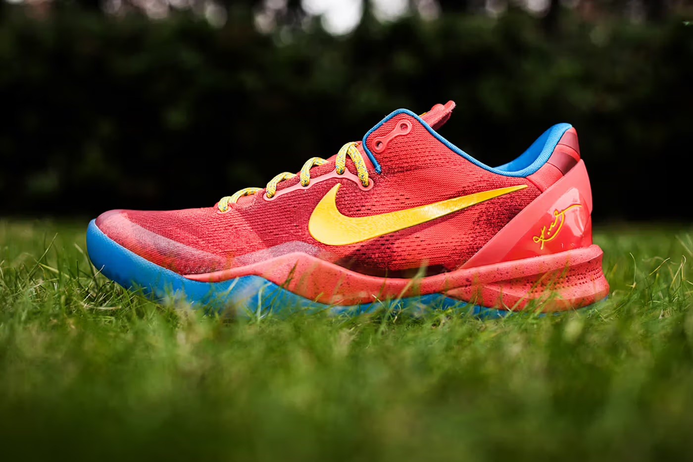 Nike Kobe 8 System cũng đi theo hướng đó: họa tiết vảy đỏ đậm, chữ Trung Hoa nổi bật.
