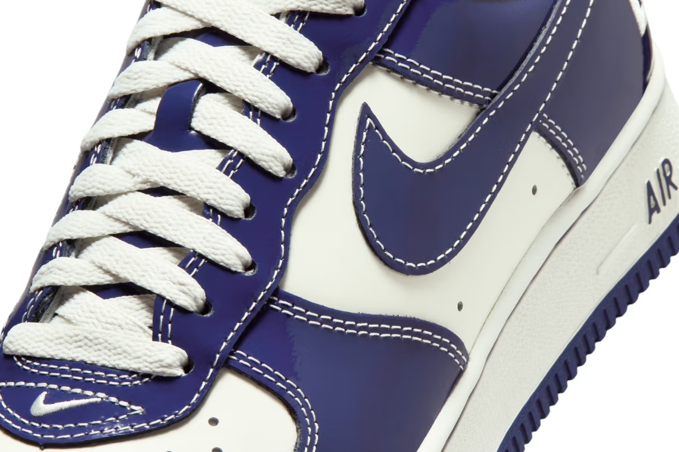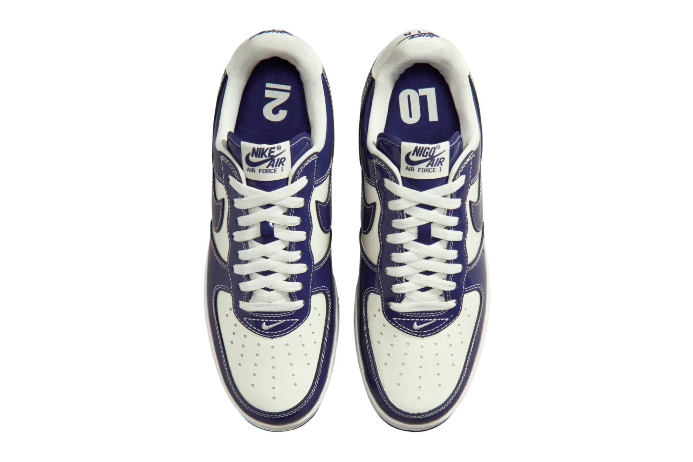 Phiên bản Nike x NIGO LO2 Air Force 1 tái hiện lại form dáng cổ điển của Air Force 1 năm 2001, với phần mũi giày thon gọn hơn và cảm giác ôm chân mang tính thể thao rõ rệt. Thiết kế nổi bật với lớp da patent bóng loáng, phủ lên hai gam màu chủ đạo là Sail và Loyal Blue. Đây không phải lựa chọn ngẫu nhiên, mà bảng màu được lấy cảm hứng trực tiếp từ biển hiệu cửa hàng NOWHERE, boutique biểu tượng của NIGO và Takahashi tại khu Ura-Harajuku.